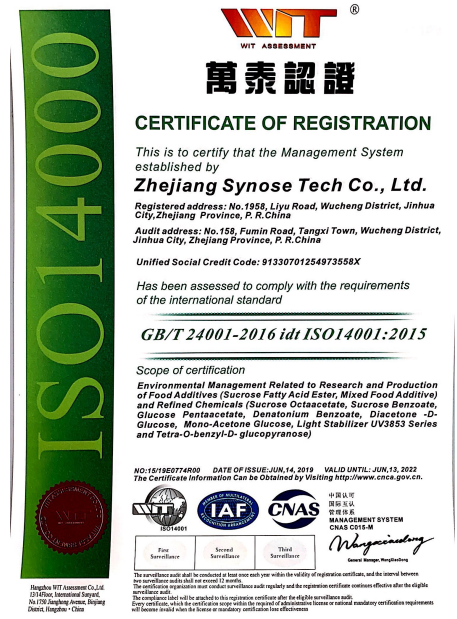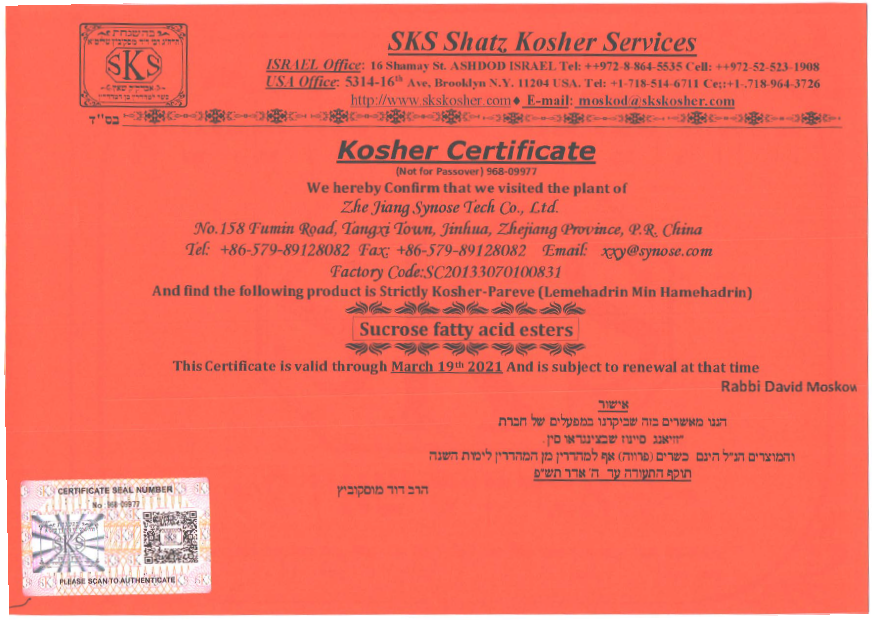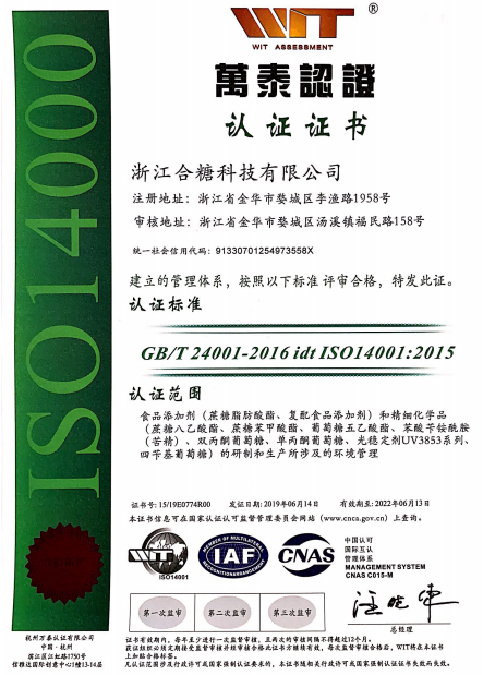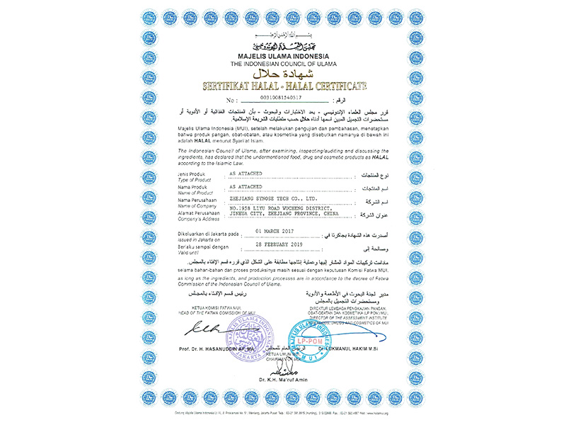 公司被評(píng)為“國(guó)家高新技術(shù)企業(yè)”,并有多個(gè)產(chǎn)品獲得“國(guó)內(nèi)發(fā)明專(zhuān)利”,通過(guò)了FSSC22000食品安全體系認(rèn)證,ISO14001環(huán)境管理體系,MUI HALAL認(rèn)證,SKS KOSHER認(rèn)證,ISO9001質(zhì)量管理體系和ISO22000食品安全管理體系認(rèn)證,并有多個(gè)產(chǎn)品通過(guò)了“歐洲REACH法規(guī)”注冊(cè)和“韓國(guó)REACH法規(guī)” 預(yù)注冊(cè)。